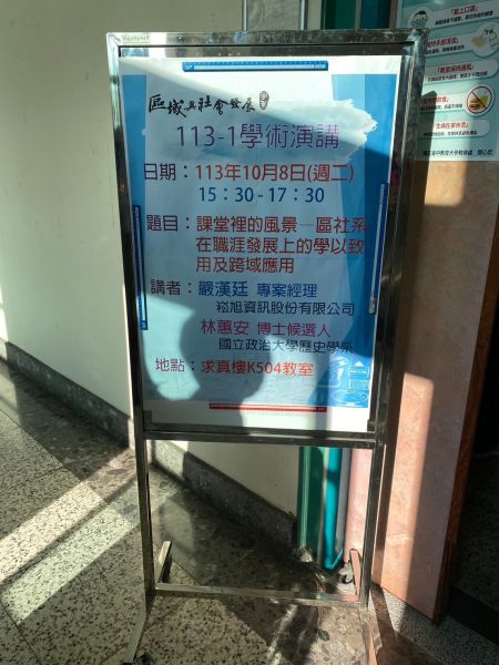 第二部分則是「課堂裡的風景-區社系在職涯發展上的學以致用及跨域應用」,另一位講師分享走在學術研究道路上的經歷,從區社系的大學日子,到研究所推甄,以及研究生活與工作。講述如何在大學中透過跨域、場域、教育三方面累積自我競爭力,應用在碩班及博班的研究所申請,並更加加值應用在求職方面。