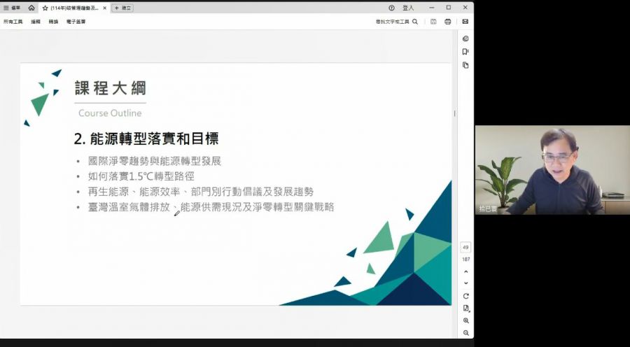 呼應全球趨勢,臺灣於2023年訂立《氣候變遷因應法》來因應全球氣候急遽變遷、天災頻發的全球暖化現象。經濟部產業發展署基於企業需求,考量臺灣政府淨零政策、企業雙軸轉型及減碳需求,因此發展出「iPAS 淨零碳規劃管理師」產業人才能力鑑定考試,以培養、儲備及審核具有能力的碳規劃管理專業人才,以協助解決臺灣企業的碳焦慮。本次淨零碳規劃管理師研習營由本校及銘傳大學執行「經濟部產業發展署碳盤查應用加値計畫」的敎授團隊與社團法人臺灣文化創意產業學會共同辦理第二期線上課程,藉以協助報考「iPAS 淨零碳規劃管理師」能力鑑定的人員。