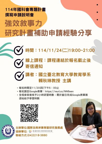 本場說明會計有 19 位師生出席。講座內容豐富,從投稿失利的經驗反思,到學術社群經營(如尋找志同道合研究夥伴),乃至選題策略與學門定位,皆有深度著墨。講者的「實戰心聲」有效縮短了參與者與計畫申請的距離,活動成效顯著。
