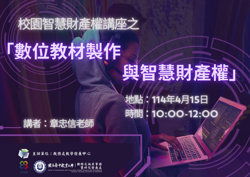 本校於今日舉辦「數位教材製作與智慧財產權」專題講座,因應數位化教學趨勢,本次活動特別採取線上會議方式進行,邀請到智慧財產權專家章信忠老師擔任主講。