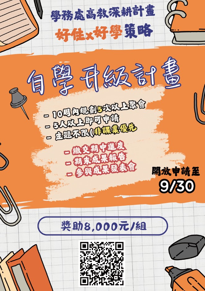 本次自學升級計畫為學務處推動的「六好策略」中的好住x好學策略, 鼓勵同學透過自主學習,探索個人興趣並培養專業能力,在課堂之外建立自律與團隊合作的能力。